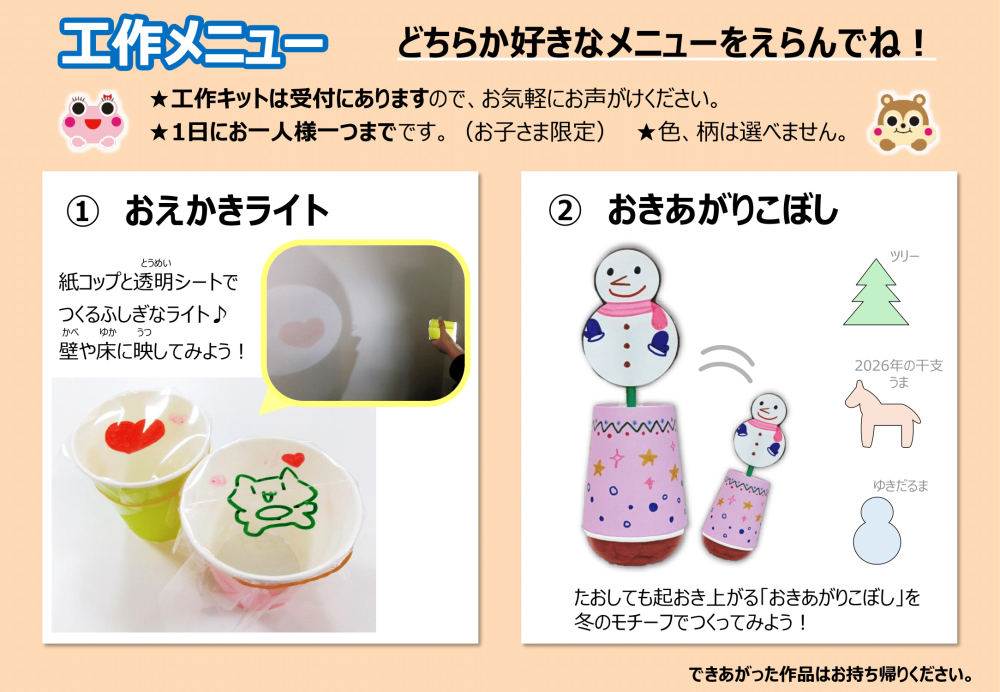 フリー工作が新しくなります!カテゴリー:お知らせ続きを見る フリー工作のメニューが新しくなります!カテゴリー:お知らせ続きを見る 休館日変更についてのお知らせカテゴリー:お知らせ続きを見る 年末年始休館のお知らせカテゴリー:お知らせ当センターは2025年12月27日(土)~2026年1月3日(土)まで休館いたします。新年は1月4日(日)より開館です。続きを見る